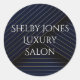 This chic luxury salon business sticker features your company info in elegant typography on the chic navy blue and gold striped background. The design is reminiscent of curtains about to open behind the white text. Customise these labels with your corporate name for a modern mailing accessory.
