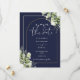 This elegant navy blue botanical greenery floral gold arch save-the-date invitation can be personalised with your information in chic typography with your wedding website QR code and details on the reverse. Designed by Thisisnotme©
