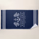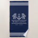 Lake house beach towel in navy blue and white with a nautical monogram with an anchor, greenery, and rope. Add your initial and your family name and year established. Beach house towel in navy and white with an anchor monogram framed by greenery, and your family name framed by rope.