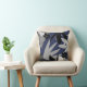 Modern throw pillow features an artistic abstract tropical botanical design in a navy blue and grey colour palette with black accents. This abstract composition is built on combinations of organic leaves and flowers, which are overlapped and interlaced to form a stylish organic tropical patterned design. The grey design elements with black accents compliment the navy blue background.