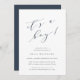 Simple and elegant baby shower invitation features "it's a boy" in navy blue calligraphy lettering. Personalise with your baby shower details beneath. Customise the paper type or shape to make this elegant design your own, and add your baby shower details to the back, eliminating the need for enclosure cards. Includes three customisable text fields (shown with a book request, diaper raffle, and registry info) and a custom QR code for your registry.