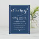 Cute and modern baby shower invitation featuring white calligraphy script on navy blue background with stripes pattern. This design is available in a variety of colours.