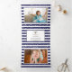 Navy bue joy and berries Christmas holiday trifold photo card. The cover showcases the word "JOY" with red berries and greenery while instead of the letter "O" there is your photo. The inside first and last panels as well as the ourside flap feature a pattern of navy blue and white stripes and snow that form frames for your photos. The inside middle panel displays a frame with your wishes accented with red berries and greenery. Some photos are of Photography © Storytree Studios, Stanford, CA