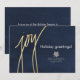 Include your logo on the front and special message on the back of this classy corporate business Christmas or Holiday card, Joy in bright gold script lettering, Modern, elegant navy blue watercolor background with gold effect fancy script text. Stylish flat greeting card. Design Copyright © CustomChristmasPhotoCards.com