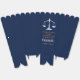 This modern custom law school graduation party popcorn favor box features the college graduate name in elegant gold on a navy blue background for the class of 2026. Customize with your university under the scales of justice for a great graduation keepsake for a new lawyer or attorney.