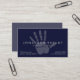 Two tone navy blue handprint design massage therapist business card. Business card text is printed in light grey ink but can be changed to colour of your choice by using the customise it feature. Simply type in your information using the template.