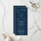 Minimal wedding program featuring modern script font on a navy blue background. All the wedding ceremony information and the wedding party's name listed on this program.