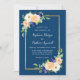 These modern wedding invitations feature a watercolor floral design with white, coral and navy blue flowers and a faux gold border on a navy blue background. Personalise the invitation wording with your own text.