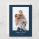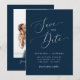 Modern and minimal save the date card featuring an elegant script that says "save the date" on navy blue background in the middle with the brief wedding information. You can add a photo on the back.