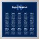 Dark, navy blue seating chart poster in 32 inch square size with monogram initial. White text templates are provided to list ten guests’ names at each corresponding table. Table number headings are in bold, white text to match the font used for the couple’s names at the top. Each table section has space to list ten names making this chart able to seat 150 guests, or more if names are doubled up. Table sections can also be deleted to seat fewer guests. One monogram initial, in lighter blue, is printed behind the names at the top. A thin blue line frames the entire chart.
