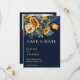Dark Navy blue moody rustic sunflowers fall wedding photo template save the date invitation, summer fall wedding save the date blue and yellow themed wedding