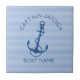 Navy blue nautical boat anchor illustration with light blue and white tin stripes pattern. Customisable text in navy blue.