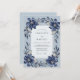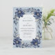 This design showcases deep navy blue and dusty blue watercolor anemones with dark centers. Delicate leafy stems and foliage surround the central area against a soft, textured blue background. The cool color palette and artistic floral arrangement create a serene and sophisticated atmosphere suitable for a formal winter or early spring event.