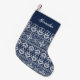 Rich navy blue and white Nordic sweater patterned stocking features your name or monogram at the top in white calligraphy script lettering.