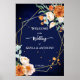 Orange and white roses sage eucalyptus greenery navy blue background gold geometrical frame floral personalised name wedding welcome sign poster instant download