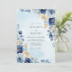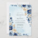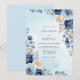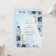 This design features a sophisticated palette of navy blue and soft ivory florals set against a delicate pale blue watercolor background. Lush watercolor roses and creamy peonies are intertwined with silver dollar eucalyptus and golden-hued leaves. The painterly style evokes a serene and romantic atmosphere, making it ideal for a formal seasonal event.