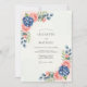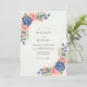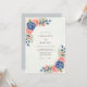 This design features a delicate watercolor arrangement of lush navy blue hydrangeas and soft peach roses. The botanical aesthetic creates a refined and romantic atmosphere perfect for a spring or summer event. Accented by sage green eucalyptus leaves, the color palette balances deep jewel tones with light pastels for a sophisticated look.