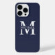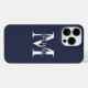 featuring personalised white monogram in classic serif font style with box of name in the middle of monogram on navy blue background.