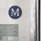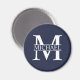 featuring personalised white monogram in classic serif font style with box of name in the middle of monogram on navy blue background.