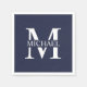 featuring personalised white monogram in classic serif font style with box of name in the middle of monogram on navy blue background.