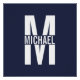 featuring personalised monogram in white bold modern sans serif font style with box of name in the middle of monogram on navy blue background.