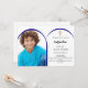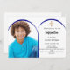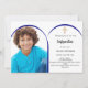 Add your own vertical size photo. A navy blue coloured arch shaped photo frame. A white background colour. Personalise and add a name and details.
