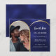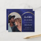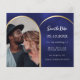 On front: Add your own vertical size photo. A faux gold photo arch frame. A navy blue background, white text. The blue colour is uneven. Personalise and add your nams and the date.