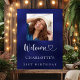 A welcome poster for a girly and glamourous 21st (or any age) birthday party. A navy blue background. The blue colour is uneven. Personalise and add a photo, name and age 21. White letters. Welcome with a heart.