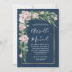 Features a spray of silver dollar and seeded eucalyptus over a navy blue watercolor wash background with a gold border. Design also features elegant floral elements of roses & peonies in dusty rose or blush pink for a unique look.