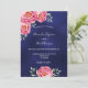 A trendy, modern wedding invitation. A dark blue navy blue background. The blue colour is uneven. Decorated with lush pink watercolored peonies flowers, florals and som grey green greenery. Templates for your names and ceremony information. The names are written with a modern hand lettered style script. White text.