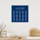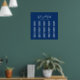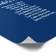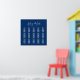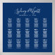 Square, navy blue seating chart poster with white text templates. Plain, dark blue with big names of the bride and groom at the top in modern, handwritten script. The date is printed below the names. This template seats up-to fifteen tables with eight guests seated at each. Customise as needed for your event by deleting tables, and / or shortening name lists. Table number text is in bolder script, with names listed beneath in printed font. You may change the poster size - this one is 24 inches square.
