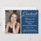 This graduation invitation features the graduate with a fun navy blue polka dot panel on the right to display all the graduation information. Available in alternate colours.