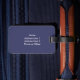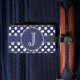 Navy blue and white polka-dot pattern with a matching stripe and round medallion for you to personalise with your monogrammed initial. Add your information or custom text on the back of the luggage tag.