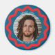 Personalize this circle magnet with your photo and descriptive text to create one of a kind magnet gifts for friends, parents and grandparents. The wavy line bottle cap style squiggle is chic and trendy in red on a navy blue background. Create your own custom magnet by using the blue edit design button to change the colors and fonts to suit your style completely.