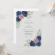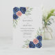 This design features a sophisticated watercolor palette of deep navy blue and soft dusty rose. Elegant navy peonies and blush pink roses are paired with muted sage green eucalyptus leaves for a classic look. The artwork evokes a romantic mood, perfect for an elegant formal event.
