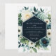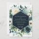 This design features a moody and elegant aesthetic perfect for a cold-weather wedding. The arrangement showcases creamy roses, deep blue anemones, and sage green succulents nestled among dark teal foliage. A rich navy blue backdrop provides a striking contrast to the lush botanical elements, creating a sophisticated and timeless atmosphere.