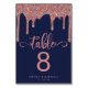 Navy Blue Rose Gold Dripping Glitter Wedding Table Number