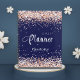 Navy blue background. Rose gold, blush faux glitter dust. Personalise and add a year and name. White letters.