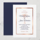 Invite your guests to help you celebrate your special day with this elegant invitation featuring modern script, rose gold copper and navy blue text including an artistic palm tree and metallic rose gold copper frame on the front. A coordinating navy blue background is on the back of the card. If you need help or a custom order, please contact me.