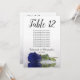 These beautiful table number cards will make it easy for your guests to find their seats at your wedding reception. They feature a simple yet elegant design with script calligraphy lettering and a single long-stemmed deep navy blue coloured rose lying on its side reflecting in water. The card includes a seating chart with 10 names. There is also space for the couple's names and wedding date. This card is available in a variety of sizes and is larger than our standard table number cards.