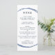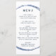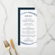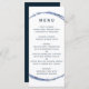 This wedding menu features a navy blue circle frame and simple calligraphy with a white background.