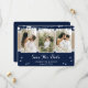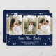 Navy blue rustic country photo wedding save the date card featuring a photo collage with string lights against a burlap and lace background.