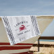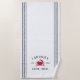 Customise your shore house or beach house with this cute personalised beach towel featuring your family name or house name and year established in navy blue lettering accented with a red crab illustration on a white background.