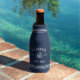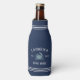 These cool personalised shore house bottle coolers feature your family name on a navy blue background, with your year established and a blue crab illustration. Rope stripe detailing at the top and bottom completes the design for a rustic nautical look.