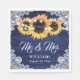 Rustic navy blue and sunflower wedding paper napkins featuring sunflowers, string lights and delicate floral lace on a rustic wood background.
