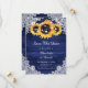 Custom navy blue rustic wood and sunflower wedding save the date cards featuring sunflower flowers on a rustic wood background adorned with white floral lace and string lights. Matching items available.