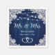 Decorate your navy blue rustic wedding party with these romantic Mr. and Mrs. wedding paper napkins featuring intertwined hearts against a rustic wood background adorned with elegant floral lace and string lights.