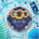 Complement your navy blue rustic country, garden, backyard, or barn wedding party with these elegant navy blue and sunflower wedding paper plates featuring sunflower flowers, string lights and delicate floral lace on a barn wood background. Matching items available.