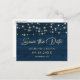 Navy Blue Rustic Wood String Lights Save The Date Announcement Postcard