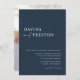 Photo wedding invitation featuring your names in elegant serif bold font with "and" and "reception to follow" in modern handwritten script lettering over an elegant Navy Blue background. Personalise with your wedding details beneath.